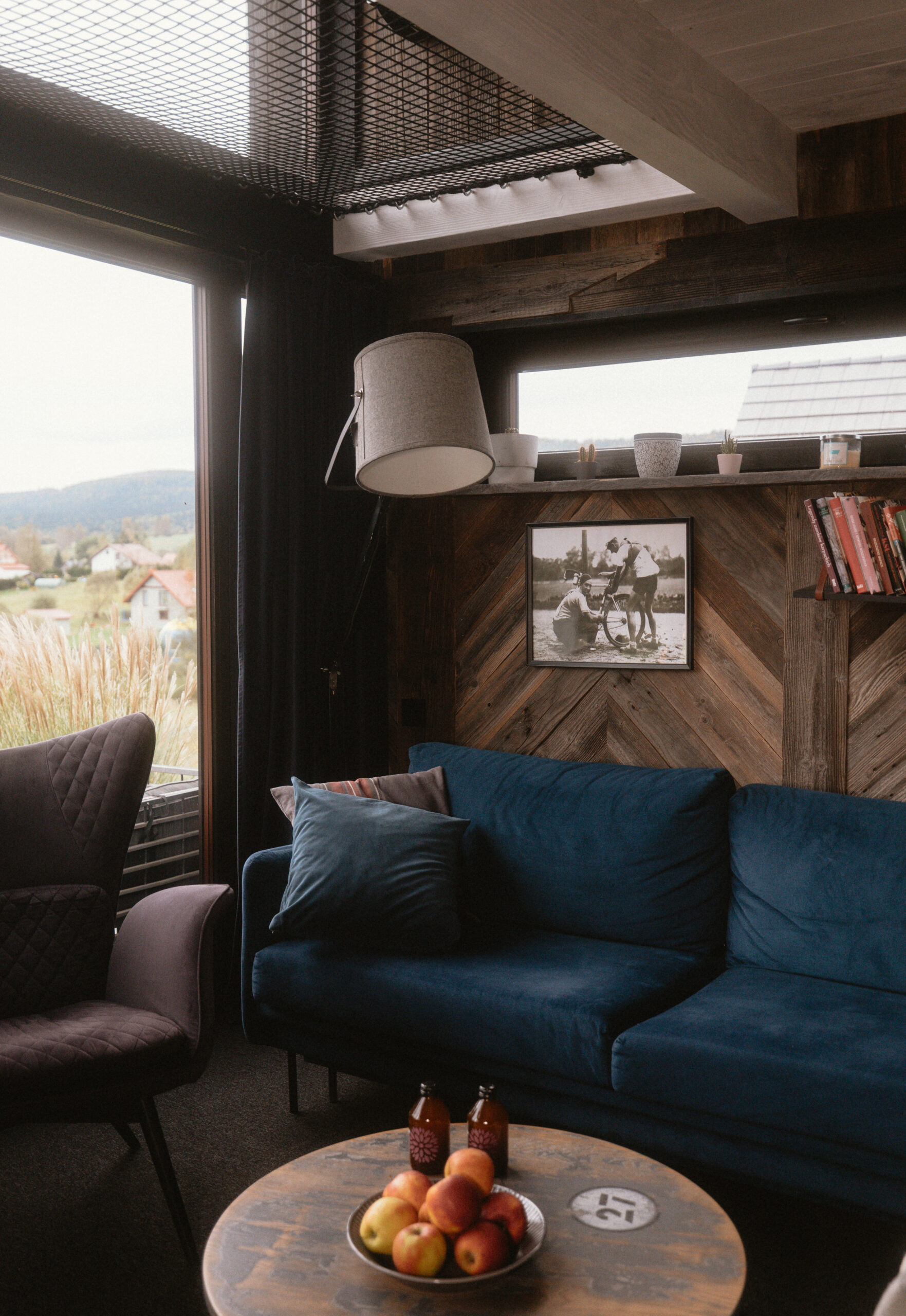 Szopa to nasz mniejszy dom, ale za to na wyłączność. Na parterze zlokalizowana jest część dzienna z salonem z rozkładaną kanapą, częścią jadalnianą i aneksem kuchennym oraz łazienka z prysznicem. Na piętrze znajdują się dwie sypialnie oraz nietuzinkowa siatka do relaksu, która wisi nad częścią salonu.